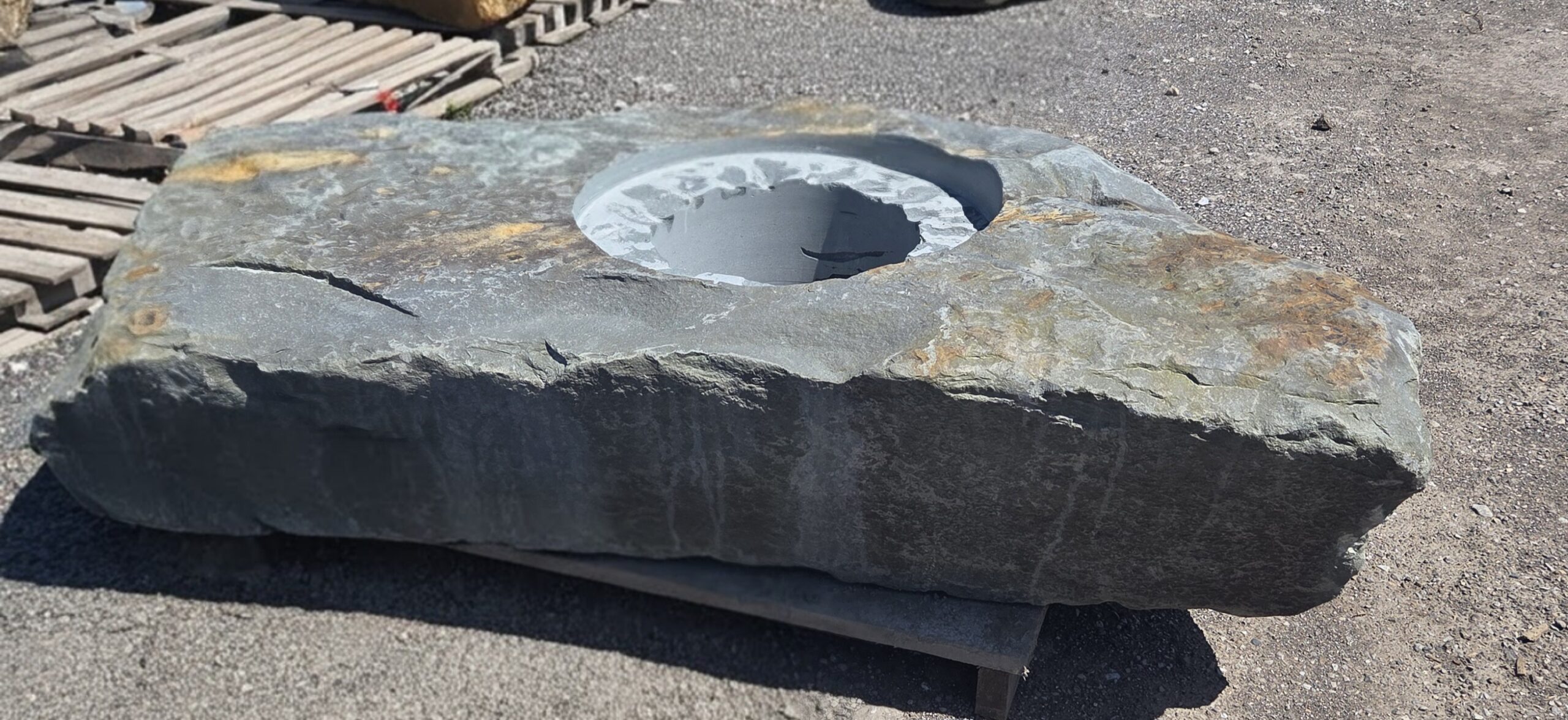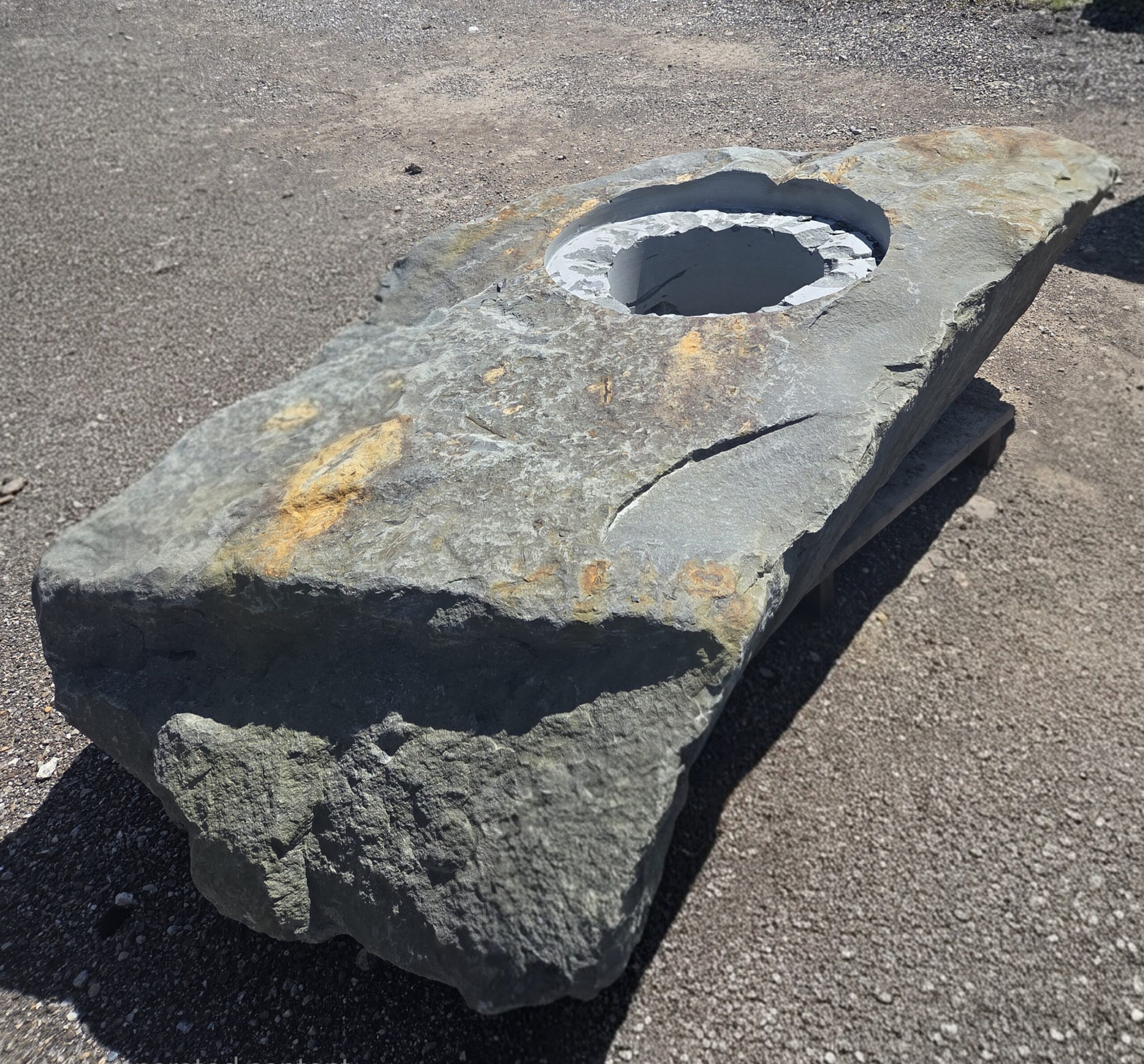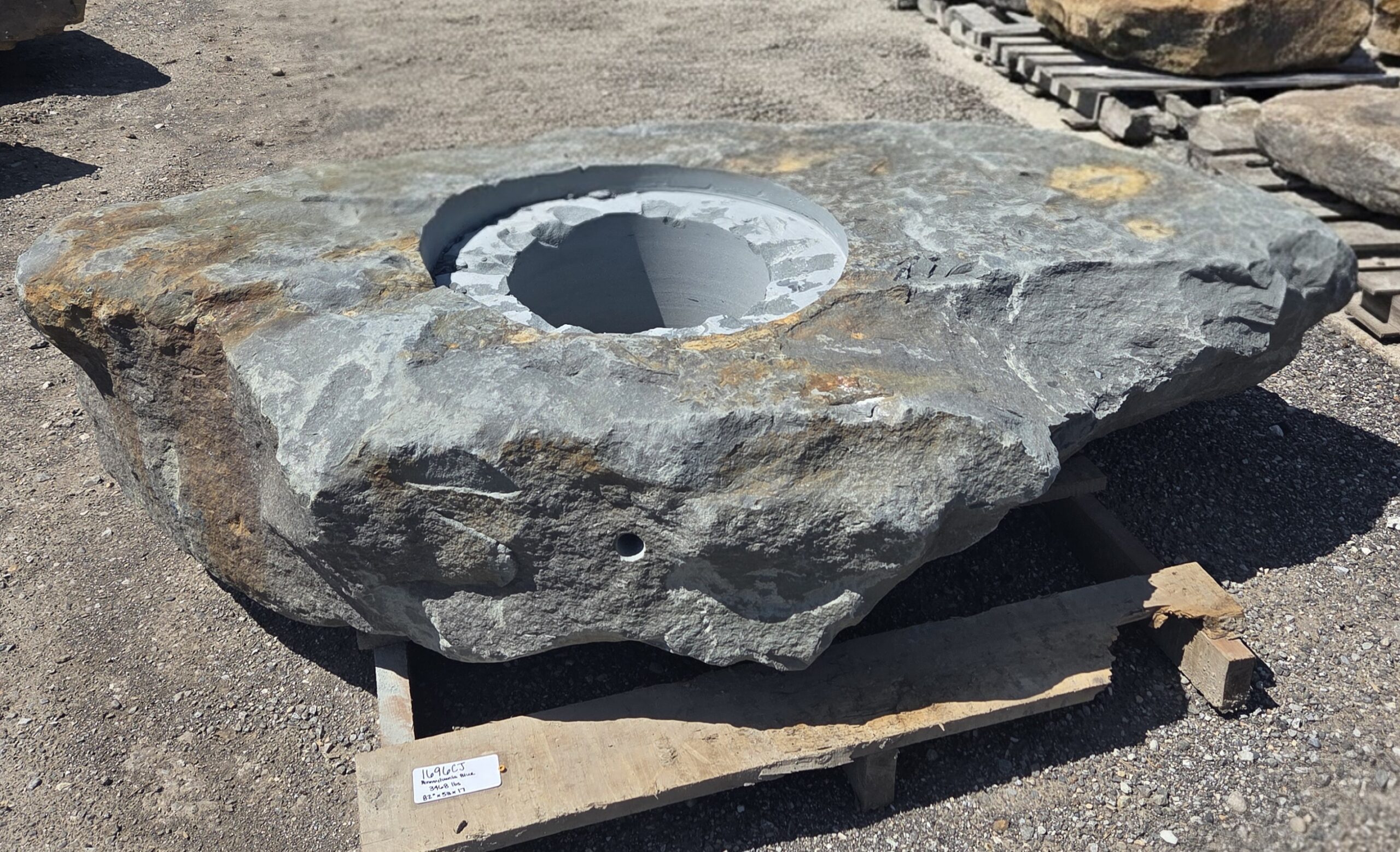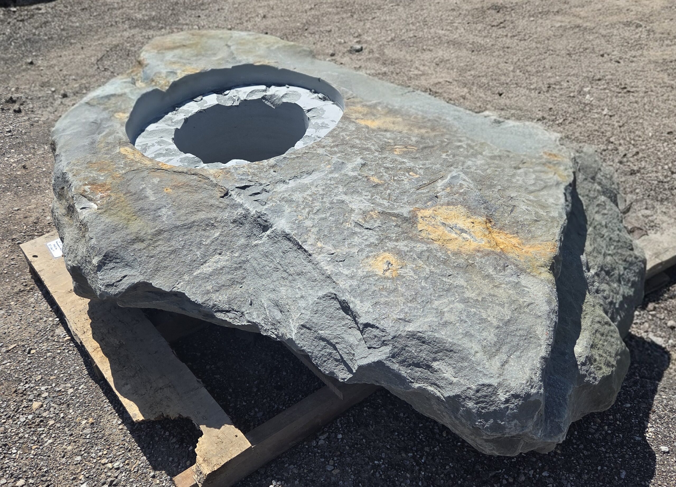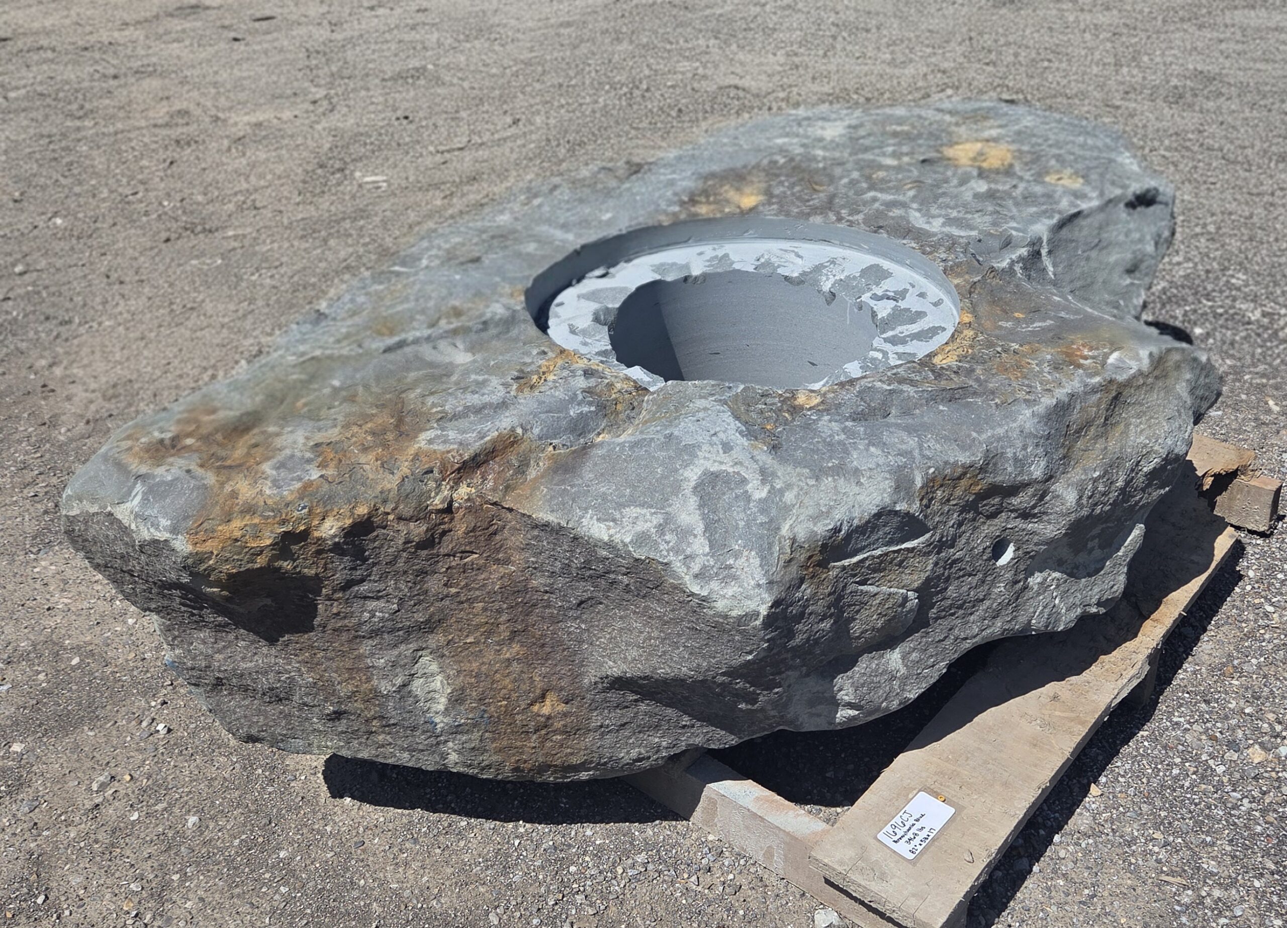 The “Cored Jumbo” Fireboulder is a one of a kind outdoor fire feature , built from a natural stone boulder and equipped with a fire burner. The “Cored Jumbo” Fireboulder possesses a 30″ cutout that is designed to accommodate a 22″ burner system. Dimensions/weights of these boulders are variable, but they typically weigh between 1,800-2,000+ pounds.