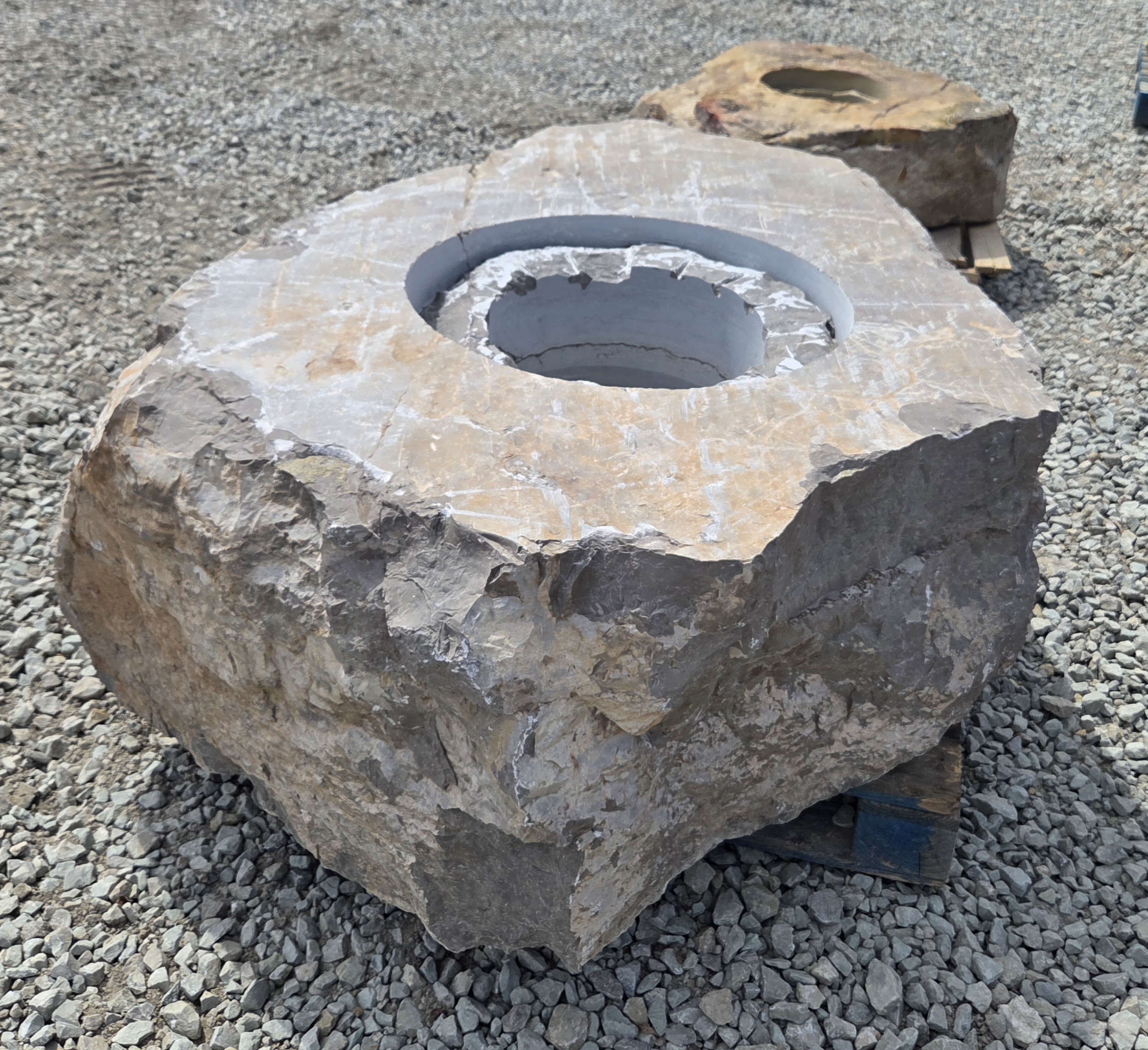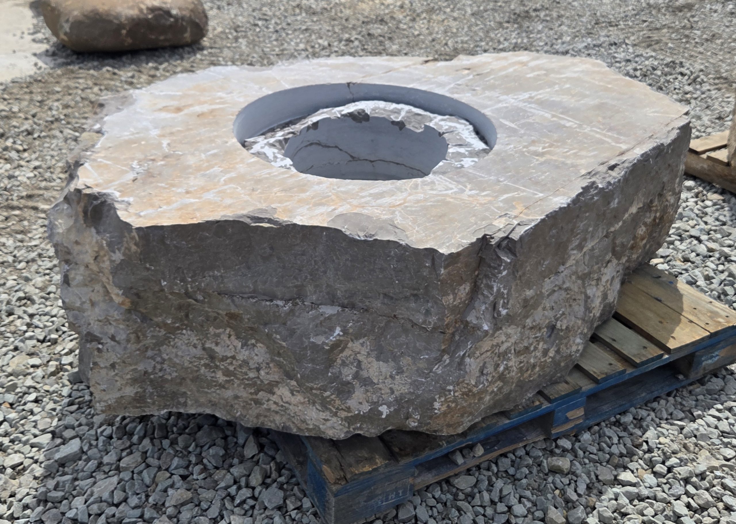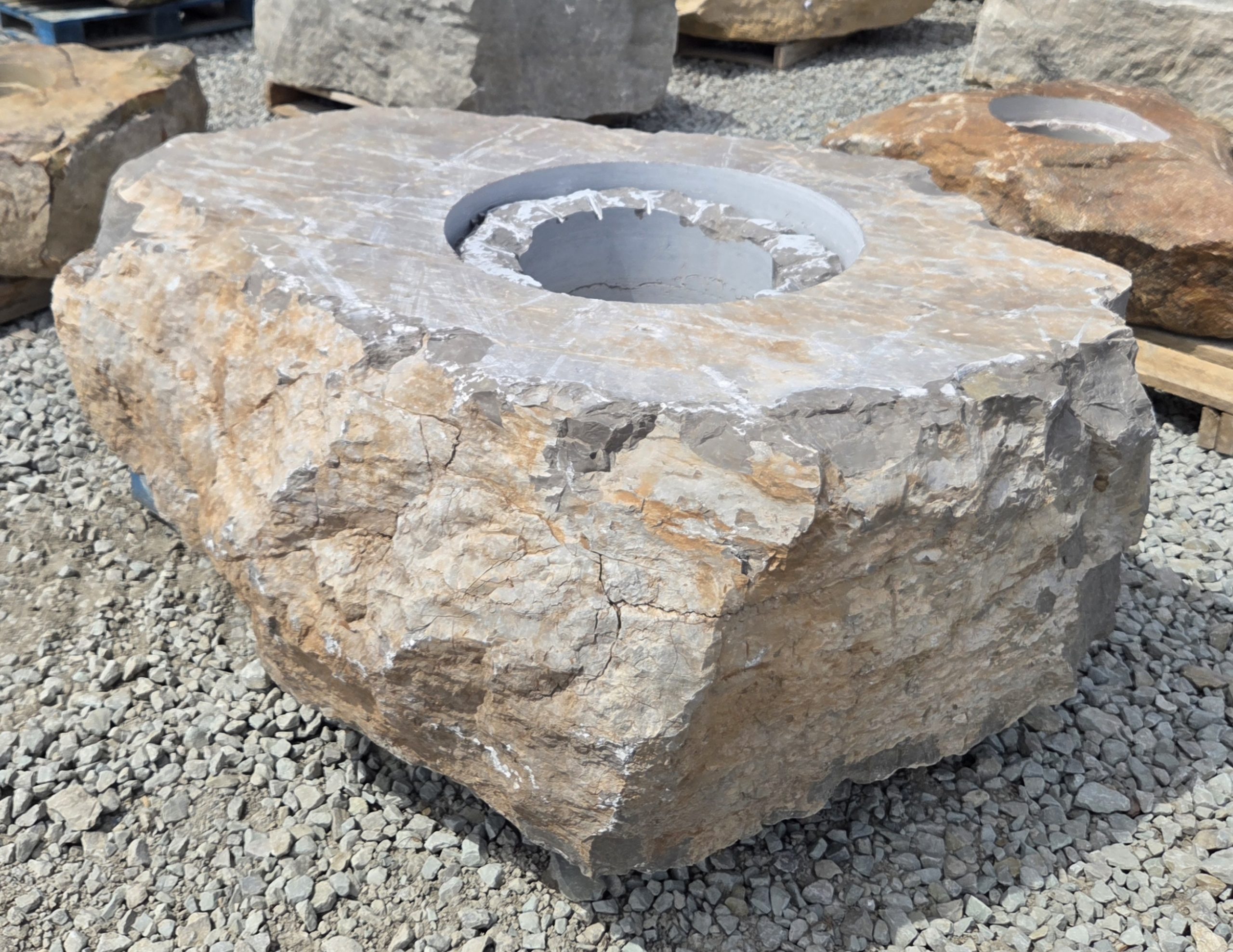 The “Cored Jumbo” Fireboulder is a one of a kind outdoor fire feature , built from a natural stone boulder and equipped with a fire burner.  The “ Cored Jumbo ” Fireboulder possesses a 30″ cutout that is designed to accommodate a 22″ or 24” burner system. Dimensions/weights of these boulders are variable, but they typically weigh 2,000+ pounds.